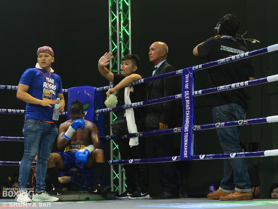 しかし3回に入ると、竹中のボディブローが明確にロサスにダメージを与え、4回にはロサスがボディをかばうように「ローブローだ」と抗議。それでもためらわない竹中は5回にボディーブローでよろけさせるまで追いつめ、逆にレフェリーからホールディングの注意を受けさせた。さらにはボディが効いたことを利用して、顔面にも力強い右ストレートを決めた竹中が、まとめにかかった中で5回が終了。インターバル中にロサスのセコンドが「これ以上戦えない」と手を振って棄権を告げた。