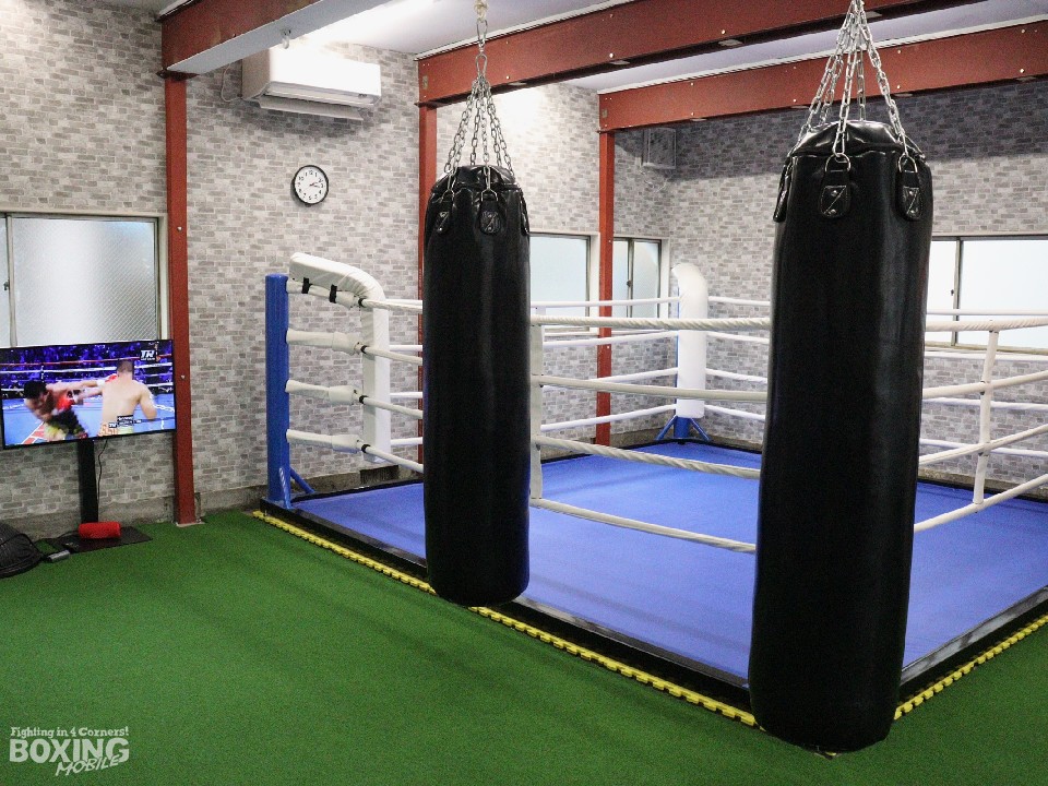 元々、倉庫だった場所を改装して、2階建てのジムを設立した。真新しいジムの1階には「どうしても置きたかった」というリング、サンドバッグ2基と、シンプルな作り。2階は、トレーニング機器が充実しており、たっぷりと汗を流すことができる。