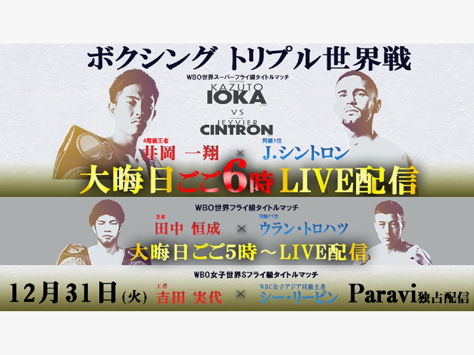 大晦日に開催されるWBO世界スーパーフライ級王者・井岡一翔(Reason大貴)vs同1位ジェイビエール・シントロン(プエルトリコ)、WBO世界フライ級王者・田中恒成(畑中)vs同11位ウラン・トロハツ(中国)、WBO女子世界スーパーフライ級王者・吉田実代(EBISU)vsシー・リーピン(中国)のトリプル世界戦を独占LIVE配信する「Paravi(パラビ)」は20日、「井岡一翔選手・田中恒成選手の世界戦を斬る!!」として、元WBC世界フライ級王者の内藤大助氏による試合の見どころの無料配信をスタートさせた。