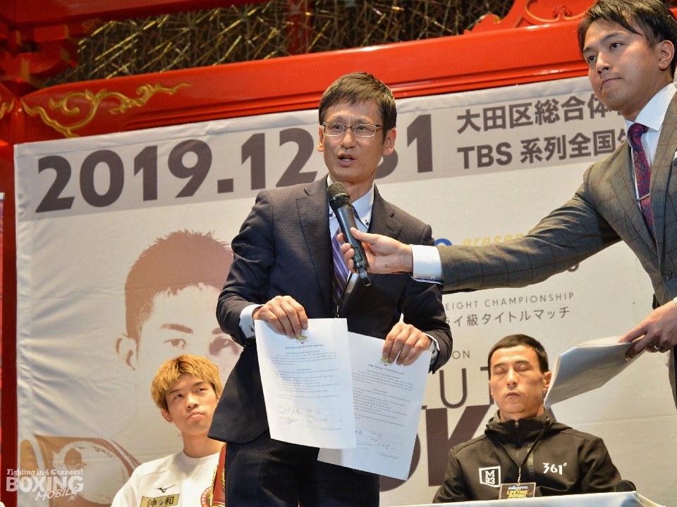 最後に日本ボクシングコミッション安河内剛事務局長の立ち合いのもと公開調印式が行われ、サインが交わされた。