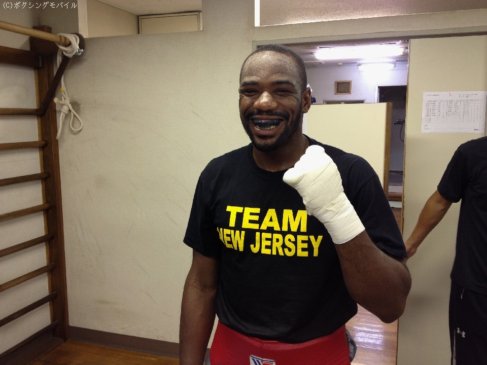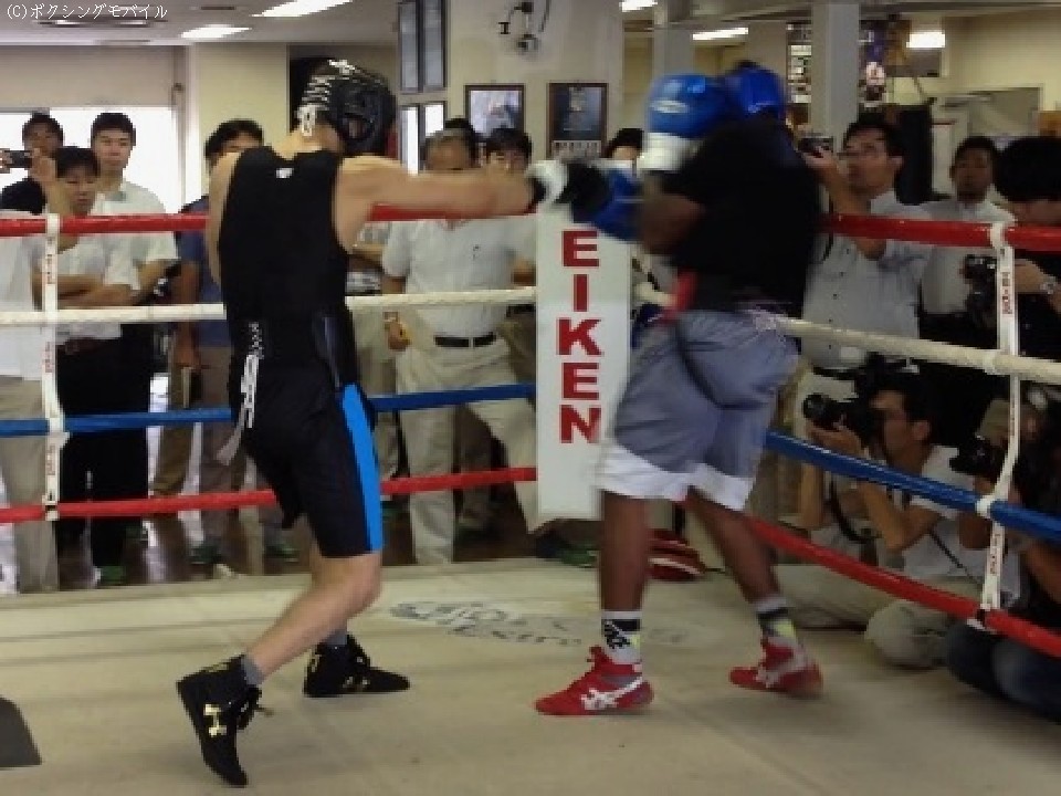 この日、村田のスパーリングパートナーを務めたのは、ラスベガス合宿でも60ラウンド程度村田の相手をしてきたというニューヨーク出身のライオネル・トンプソン、WBC世界ライトヘビー級25位の右ボクサー。