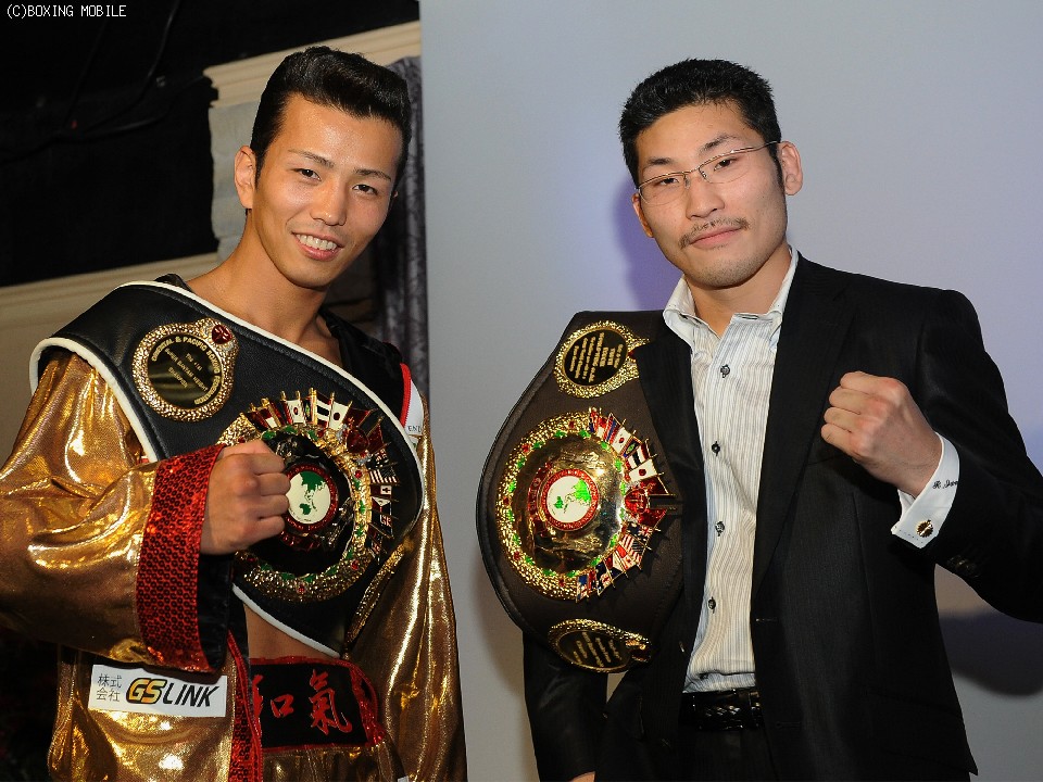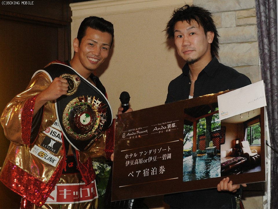 また、この日は和氣と親しいOPBFバンタム級王者の岩佐亮佑(24=セレス)も駆けつけ、和氣を祝福。今月6日にノンタイトル戦を戦い終えたばかりの岩佐は、流石に次戦については未定だが、「次が防衛戦になるかは分かりませんが、世界に向けて一歩ずつ進むだけです」とし、階級は違えど同じ道を歩む者同士の友情を分かち合っていた。