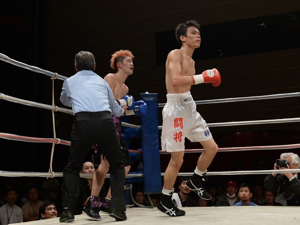 KBS京都ホールで19日、54.5キロ契約8回戦の試合が行われた。ボクシング関係者の注目を集めたこの試合は、地元Wozジムの大森将平と関西の古豪ジム、大阪帝拳所属で昨年のスーパーバンタム級新人王の見高文太によるタイトル戦を見据えた大事な一戦。
