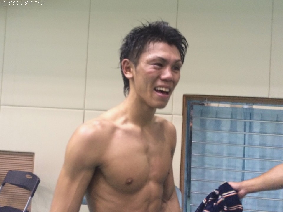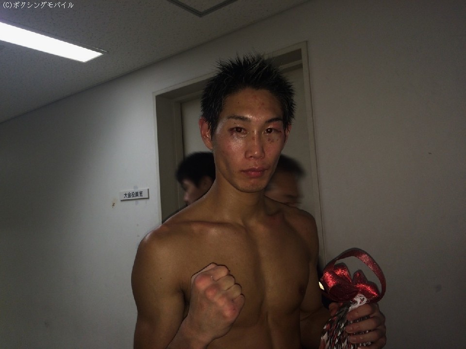「納得いかない試合でした。相手の宇佐美選手は強かったですね。2Rにもらった右は効きました。まだまだ、ディフェンスが甘いと思いました。今のままだと世界へ行ってもKO負けします。油断があったわけではないと思うんですけど、油断なんですかね。今回は調整100点で試合は50点くらいですね。ホンマに納得はいかないです。また練習がんばります。次は会長次第ですけど、格上の強い相手とやりたいです。挑戦者の気持ちで戦える相手と試合がしたいです」と、二度目の防衛に成功したチャンピオン中谷に笑顔はなかった。