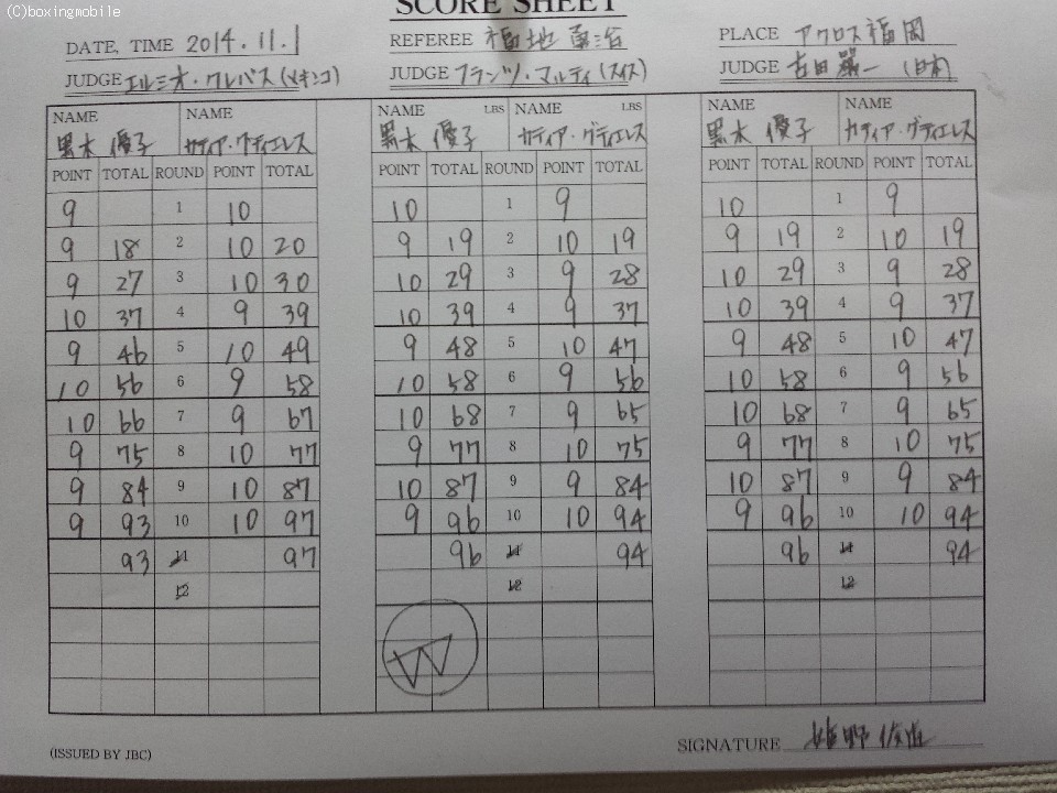 ワンツーで有効打を奪うカティアに対し、サウスポーの黒木は足を使いワンツー、ボディで応戦。カティアの右が黒木の顔面を捕えるが、黒木は前に出る。4R終了時の途中採点は(39-37,39-37,37-39)2-1で王者が優勢。5R、カティアは手数を増やし黒木を追い込む。6Rには黒木も足を止め、激しい打ち合いを展開するが7R、黒木は足を使い出入りのボクシングで有効打を重ねる。7R終了時の途中採点は(68-65,68-65,66-67)2-1で王者がリード。8R、カティアはボディを攻め、9Rには黒木にロープを背負わせ連打を浴びせる。黒木も引かず最終R、打ち合いの展開となるが決着は判定へ委ねられた。(96-94,93-97,96-94)2-1で黒木が初防衛に成功した。
