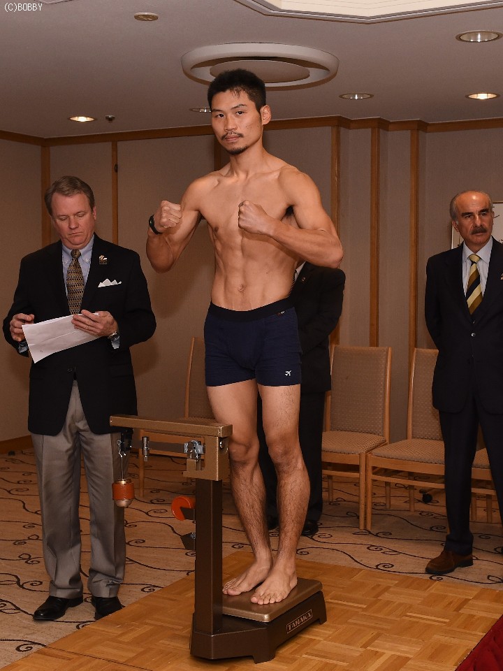 落ち着いた表情の三浦に対し、プエルタもカメラを向けるとポーズを取るなどリラックスした状態で計量に臨んだ。先に秤に乗った三浦は、リミットの58.9kgで見事パス。当然、といった表情でペットボトルの水をぐいっと一飲みした。続けて、王者より3cm身長で上回るプエルタは、右足からゆっくりと計量台に上がると、意外にも500gアンダーの58.4kgでパスし、両者とも一発クリアとなった。