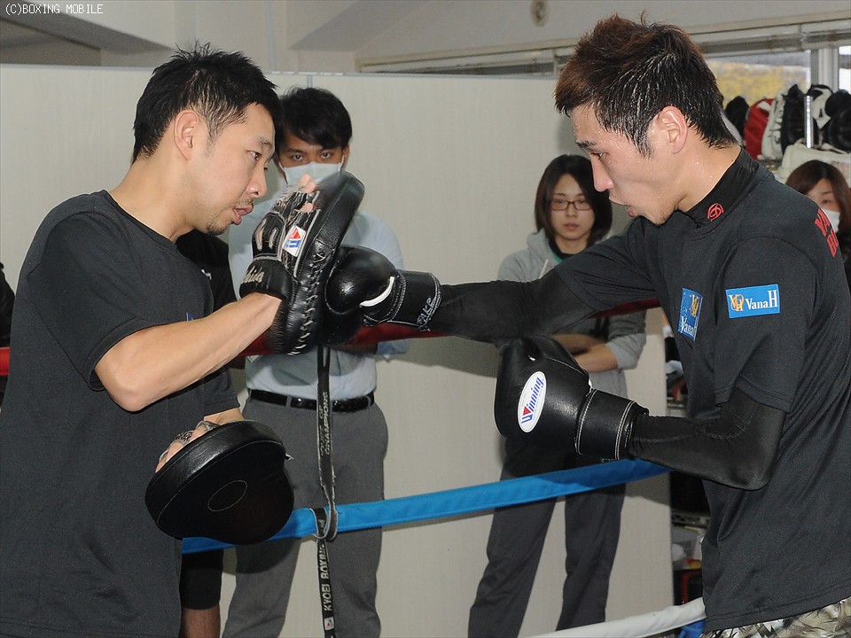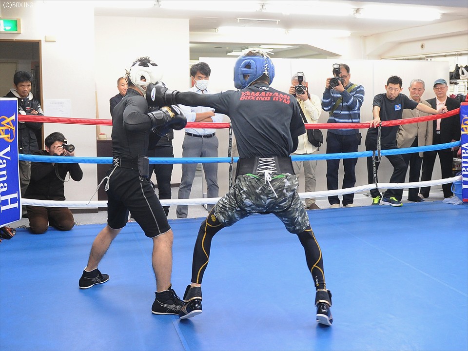 公開練習では、昨年度の全日本スーパーフェザー級新人王、サウスポーの三瓶数馬(19=協栄)と2ラウンドのスパーリングを行い、足を使う相手に対し、ジャブで詰めてはコンパクトな右をヒットさせ好調をアピール。内田トレーナーとのミット打ちでも、上下のコンビネーションを含めた重そうなパンチを次々と繰り出し、まだまだたっぷりと汗を流していた。