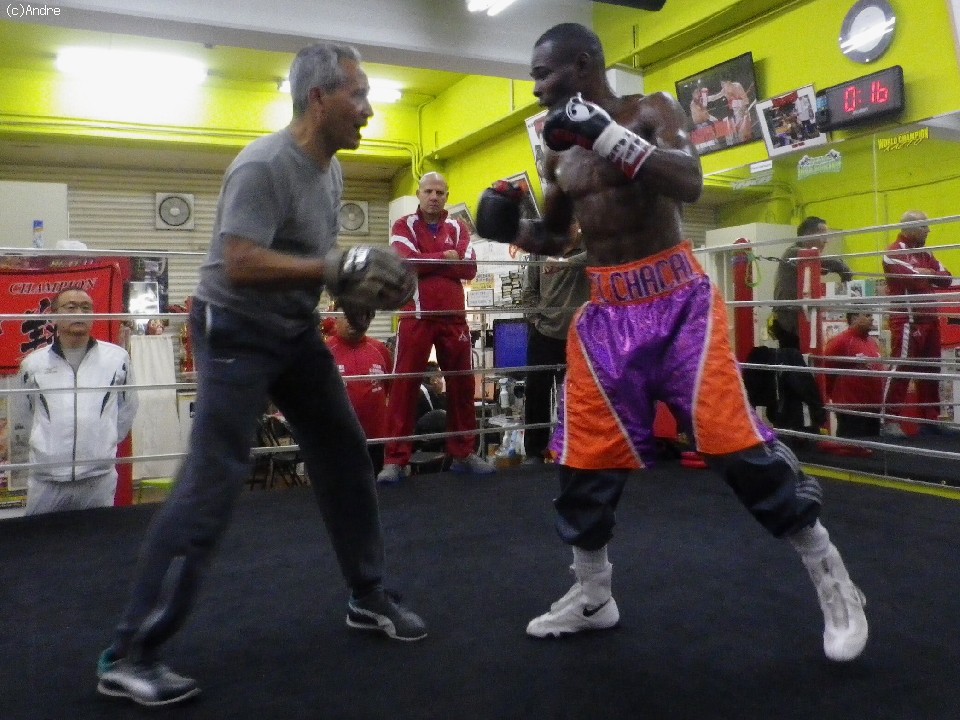 軽快な動きで練習を開始したリゴンドーは入念なウォームアップ後、独特な雄叫びを出しながら熱のこもったミット打ちを6R、バック打ちを3R、クールダウンのディフェンス練習を2Rすると大粒の汗を流し1時間の濃密な大阪での調整1日目を終了した。