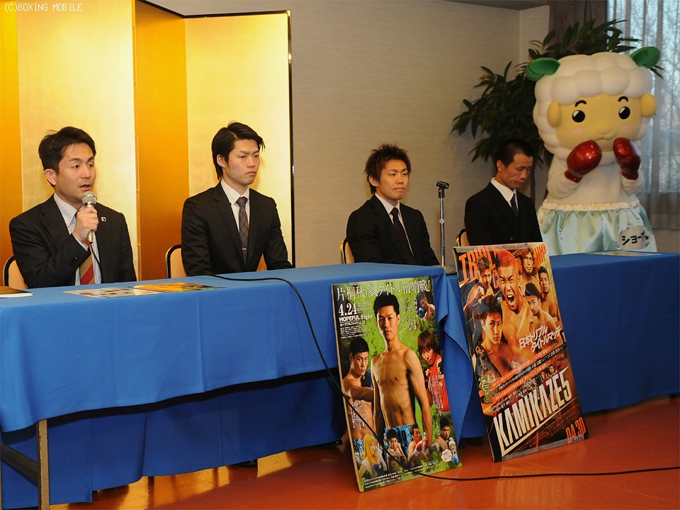 会見の冒頭、新田渉世会長は「2月から1ヶ月間のメキシコ合宿で成長した古橋、そして2年前にジョニゴン(ジョニー・ゴンザレス=メキシコ ※2階級制覇王者)に挑戦し自分の殻を破った片桐が、タイトル挑戦を目前にしています。この二人のどちらが結果を出すのか注目してください」と挨拶。片桐については、次戦クリアの条件付ながら、6月に日本フェザー級王者の細野悟(大橋)に挑戦することが決まった。