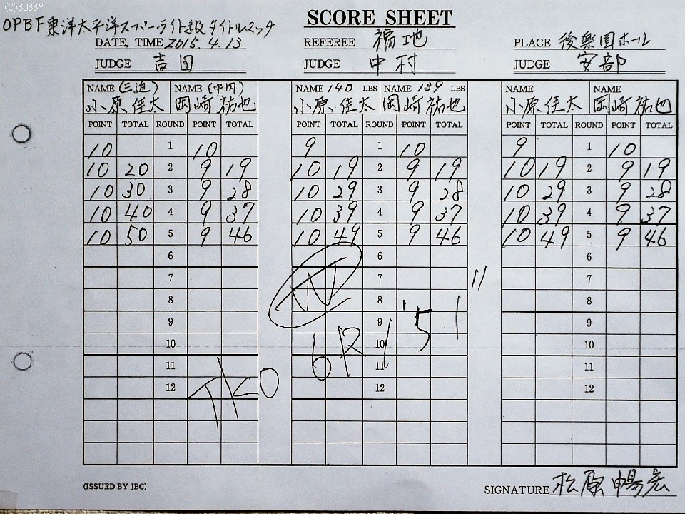 先手を取ったのは小原のジャブ。丁寧に左を突いては右ストレートに繋げリズムを掴み、2ラウンド以降はキレのある右から強烈な左ボディを突き刺した。サウスポーの岡崎も後手ながら相打ちの左ストレート、さらに右フックを返したが、小原の右を警戒してかペースは上がらず。4ラウンドの途中採点を2者39-37、1者40-37と王者にリードを許した。その後も小原のペースで進んだが、迎えた6ラウンドに岡崎の隙をついた左の一打が直撃。思わず体勢を崩した王者を見逃さず、一気に攻め込んだ挑戦者だが、打ち疲れると右をカウンターを浴び形勢逆転となってしまった。明暗を分けたこの回、小原はロープ際でガード一辺倒となった岡崎に怒涛のラッシュを浴びせ、レフェリーストップを呼び込んでのTKO勝ち。2度目の防衛をはたすと同時に、自身の連続KO記録を12に伸ばした。