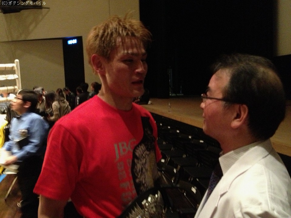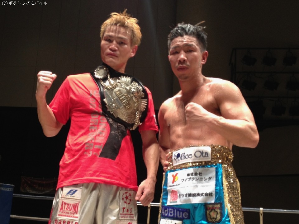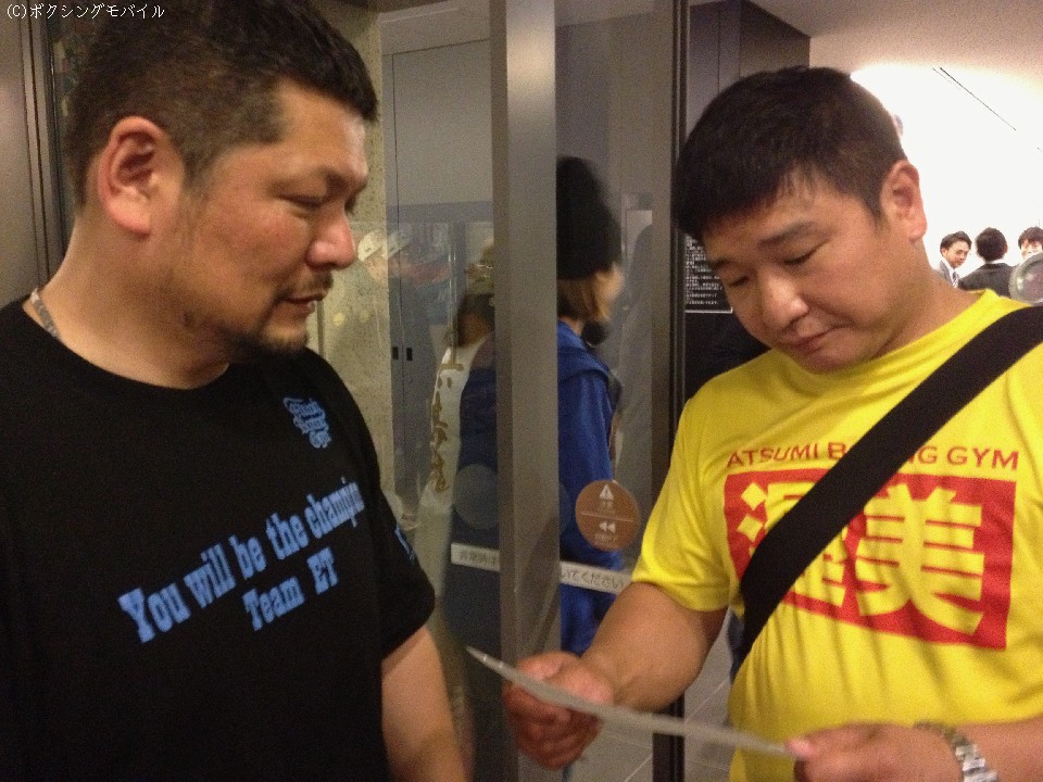 二人揃って採点表を確かめた渥美ジム大東旭会長代行と六島ジム枝川孝会長は「もう一回やろう」と年内の再戦を誓った。