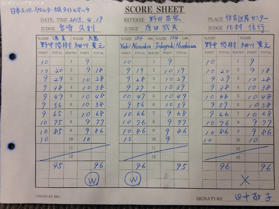 中間距離からの主導権の奪い合いは、決定打に恵まれずドロー。5回終了時に公開された僅差のリードを守れなかった細川と試合後や「負けてない」と自信の表情を浮かべた野中。どちらからとなく「もう一度やろう」とリング上で拳を合わせた。