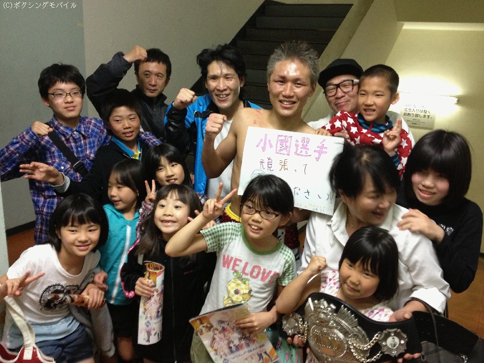 この日、会場には小國に招待された足立区の児童養護施設クリスマス・ヴィレッジの子供達が観戦に訪れていた。会見後には子供達と記念撮影。守り切ったベルトを披露した。