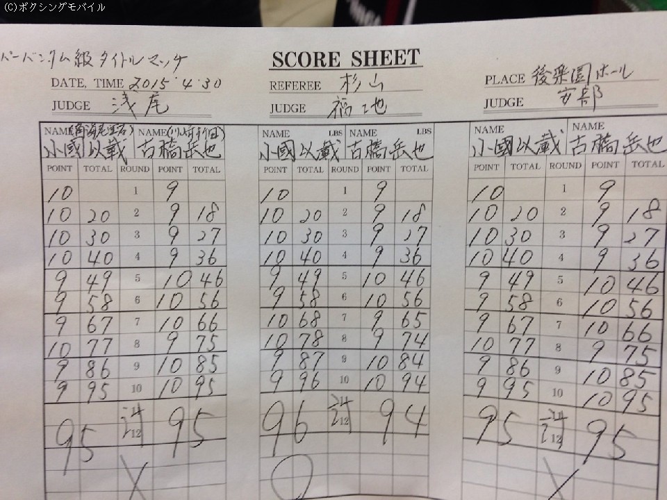 主導権争いが続いた技術戦。好戦的に仕掛けた古橋だったが、チャンピオンを捉えきれず。タイミングを計った小國が左アッパーを随所で見せると超満員の後楽園ホールは大歓声が鳴り響いた。判定はドロー。チャンピオン小國以載が辛うじてベルトを守り抜いた。