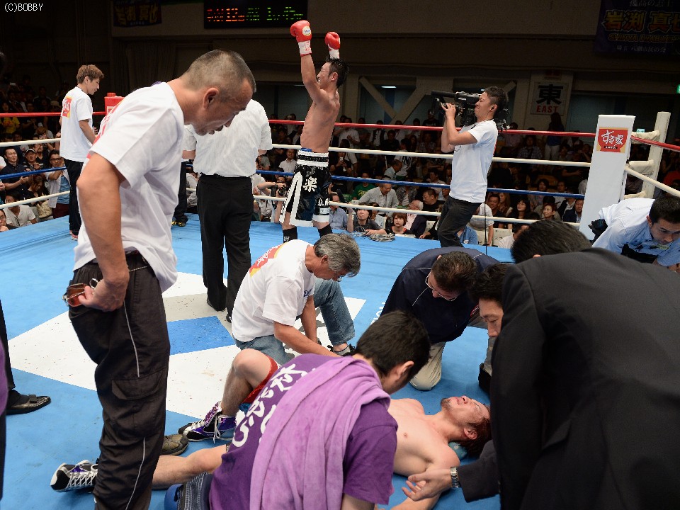 スロースターの傾向がある岩渕だが、この日は初回から積極的に自慢の強打を叩きこみペースを掌握。吉田も意地を見せて得意の右ストレートを打ち返すが、岩渕はしっかりとガード。その後も岩渕は上下にコンビネーションを決めダメージを与えると、勝負を決めにいった6ラウンド、最後は左ストレートで痛烈なダウンを奪い、粘る吉田を振り切りKO。会場を大いに盛り上げた。