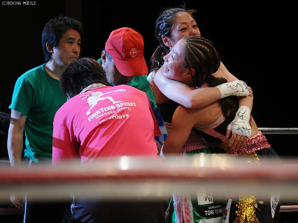 終盤に入り、アグレッシブを増した秋田屋は、ワンツーで黒木を追い込んでは細かくボディを叩いたが、黒木も左のカウンターを合わせ追い上げを許さず。このまま判定までもつれ込み、黒木が最大6ポイント差をつけ3-0で勝利。美女対決を制し、2度目の防衛に成功した。試合後は互いの健闘を称え、笑顔で抱擁を交わした。