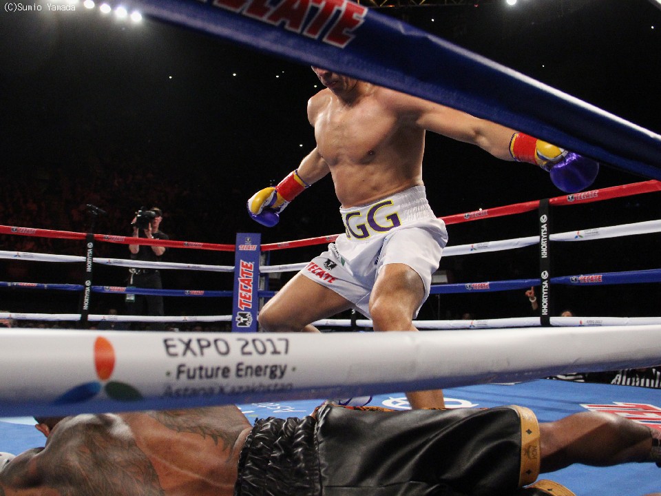 5回、ゴロフキンが左フックをヒットすると、挑戦者の腰が落ちた。これを機に攻勢に出たゴロフキンだが、足が出ない。そこにモンロー・ジュニアが左を当てて反撃。雲行きが怪しくなって迎えた6回、ゴロフキンが左アッパーから右フック、さらに左を浴びせて挑戦者からこの試合3度目のダウンを奪った。モンロー・ジュニアは立ち上がったが、レフェリーが試合をストップした。両目下がわずかに赤く染まったゴロフキンは「心地よい勝利だった。私はホンモノのチャンピオンだ。誰が最強か決めよう。まずサウル・アルバレス(メキシコ)、次いでミゲール・コット(プエルトリコ)、そしてアンドレ・ウォード(米)。誰でもいい」と、リング上のインタビューで希望を口にした。14連続KO防衛を果たしたゴロフキンは33戦全勝(30KO)、モンロー・ジュニアは21戦19勝(6KO)2敗。