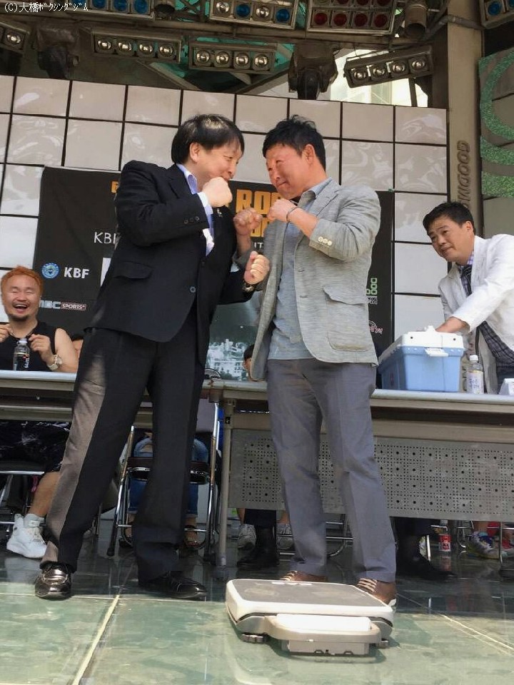 前日の公開計量では、WBA世界ライトフライ級王座を18度防衛し今回の日韓戦で韓国の監督を務める柳明祐氏と日本監督の元WBC・WBA世界ミニマム級王者の大橋秀行会長が急遽、計量対決に。大橋会長が文句なしの勝利を収め、対決後は柳氏と旧交を温めていた。