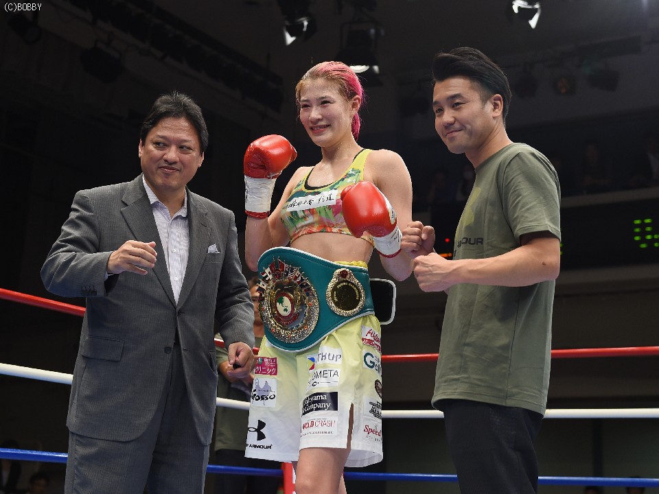 試合は高野が身長差の利を上手く使って距離を取ると、速い右フックを連打し、終始、自身のペースで試合を進めてポイントアウト。初戴冠を果たした。