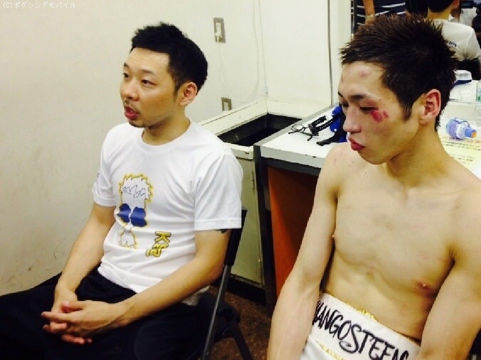 控室で天笠のグローブを外した内田洋二トレーナーは「バックステップでかわしてカウンターを取る作戦だった。出来たところもあったが、頭からこられたのでやり辛かった」と試合を振り返った。