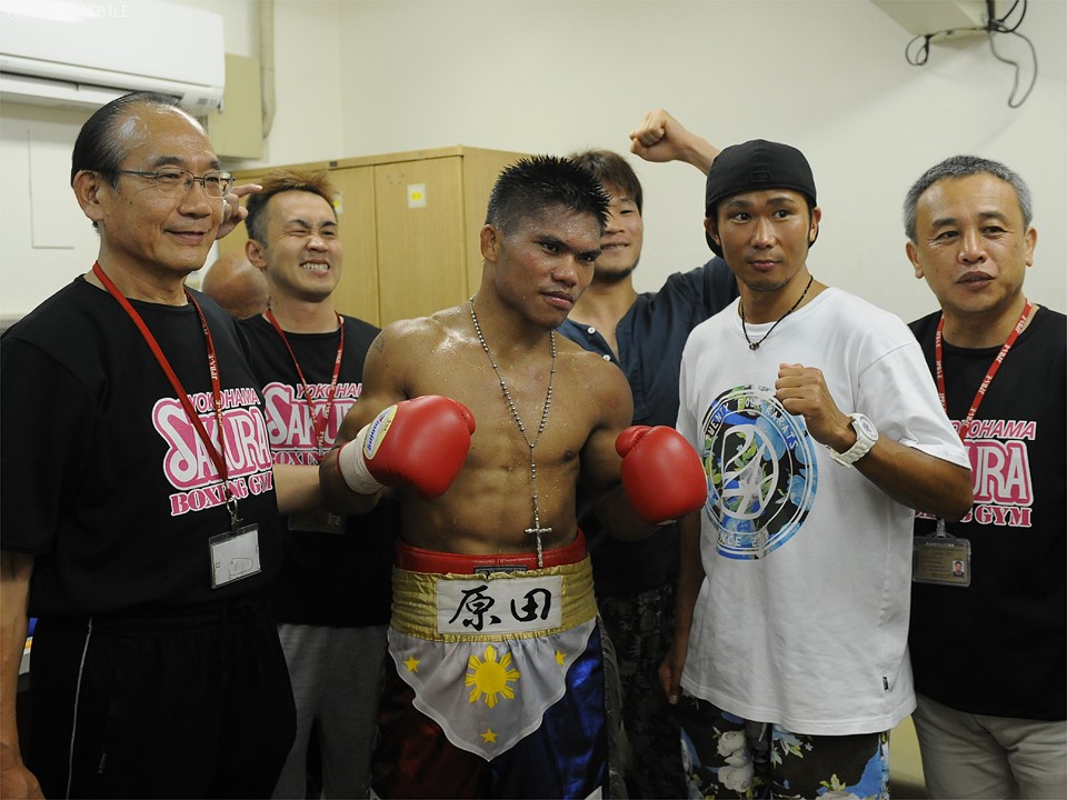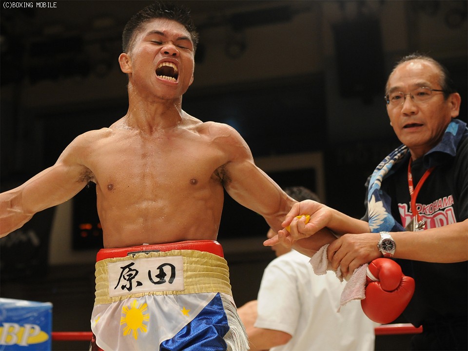 一方、フィリピン出身の原田は、控え室に戻ると支援者の歓喜の輪に包まれ、「左アッパーは少し効いたがダメージはない」と興奮した様子で話した。原田の次戦について平野敏夫会長は、候補者の一人としてWBO世界ライト級14位の加藤善孝(30=角海老宝石)の名を挙げ、会場にはその加藤の姿もあった。