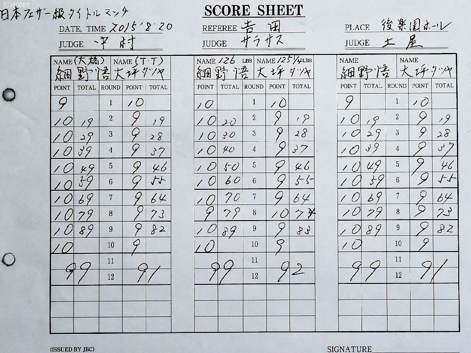 試合は、序盤こそスピードで上回る大坪を捉えきれず、不用意な一発も浴びた細野だが、圧力を掛け続け前半をポイントリードで折り返すと、7回にはバズーカの本領を発揮。左右のボディからそのまま上に返し、挑戦者をストップ寸前まで追い込んだ。だが、大坪の粘りもあり8回の決め時を逃すと、ずるずると追いつ追われつの展開が続き、10回終了のゴングを聞いた。最大8ポイント差の判定3-0勝ちを収め、3度目の防衛に成功した細野だが、笑顔はなく、控え室では反省会が続いた。