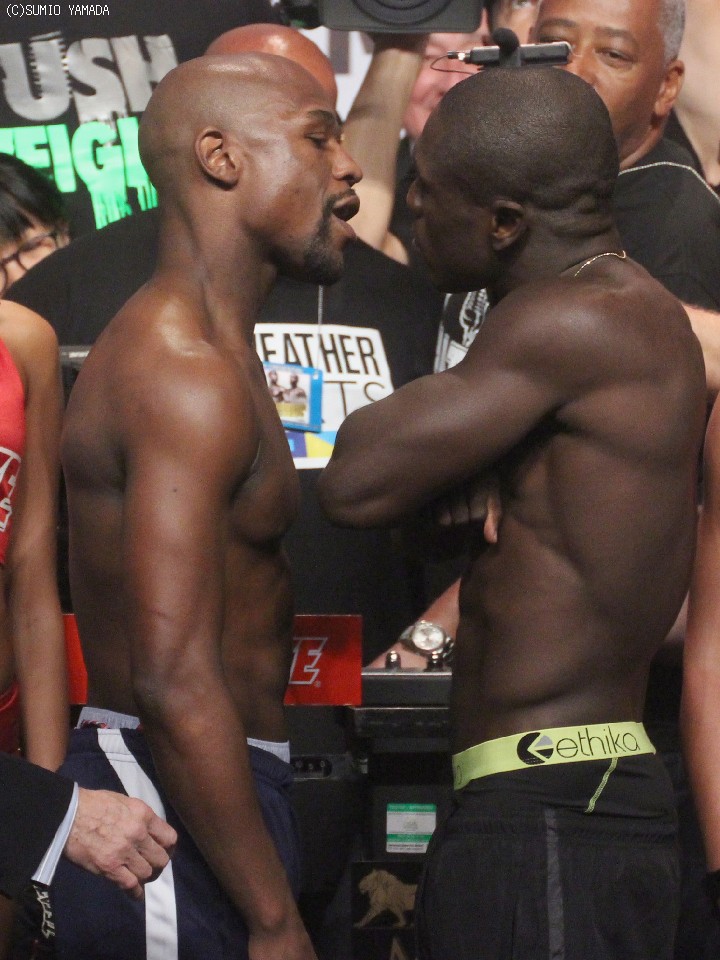 WBA、WBC世界ウェルター級タイトルマッチの計量が11日(日本時間12日)、米国ネバダ州ラスベガスのMGMグランドで行われ、両団体の王者フロイド・メイウェザー(38=米)、WBA暫定王者アンドレ・ベルト(31=米)とも無事にクリアした。試合は12日(日本時間13日)、ラスベガスのMGMグランドガーデン・アリーナで行われる。