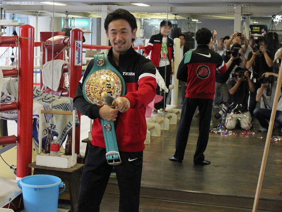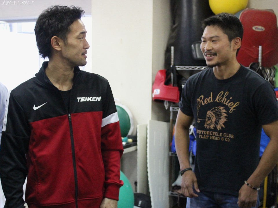 会見終了後、練習のためジムに現れた三浦隆司(31)と遭遇。昨日の試合の祝福をすると笑顔を見せ、11月にラスベガスで防衛戦を控える三浦にバトンタッチした。
