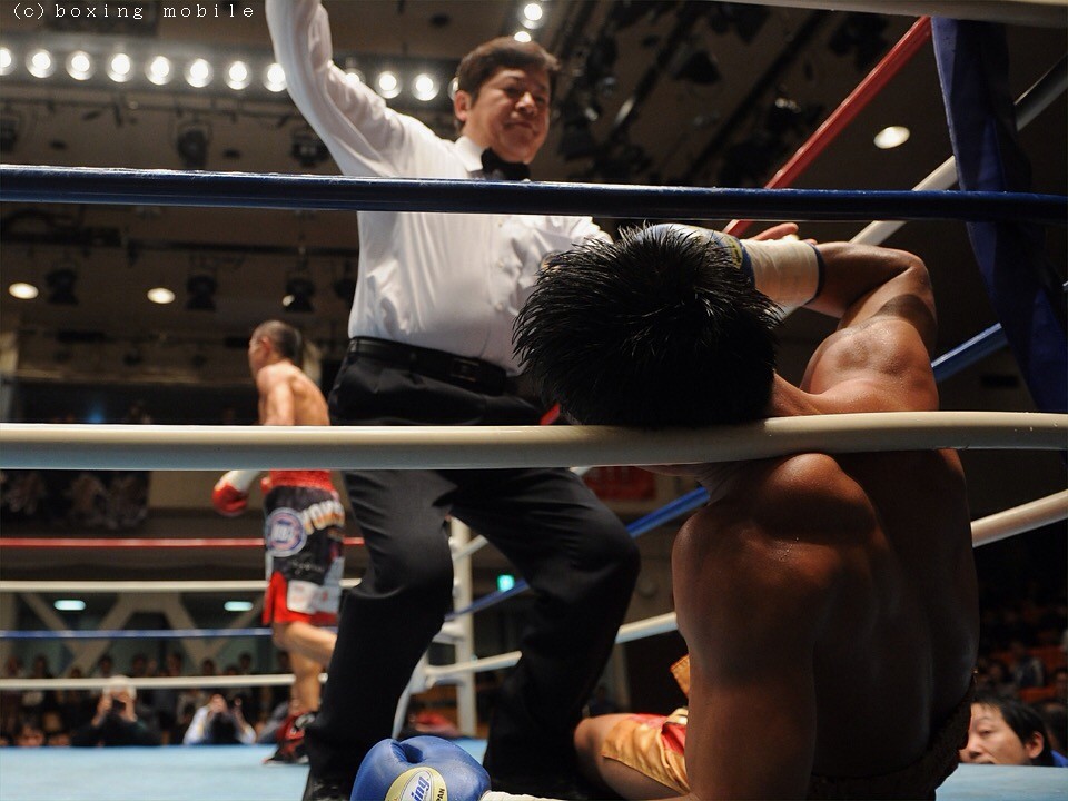 初回、慎重にジャブで様子を伺っていた大竹は、ワンツーを決め早くもペースを握る。冷静な試合運びを見せると中盤、プレッシャーをかけサンにダメージを与え、さらに得意のボディブローで追撃。チャンスとみた6回開始早々、ボディを効かせて一気に詰めて連打するとサンはしゃがみ込むようにダウン。レフェリーはすぐに試合をストップし、大竹が貫録のKO勝ちを飾った。