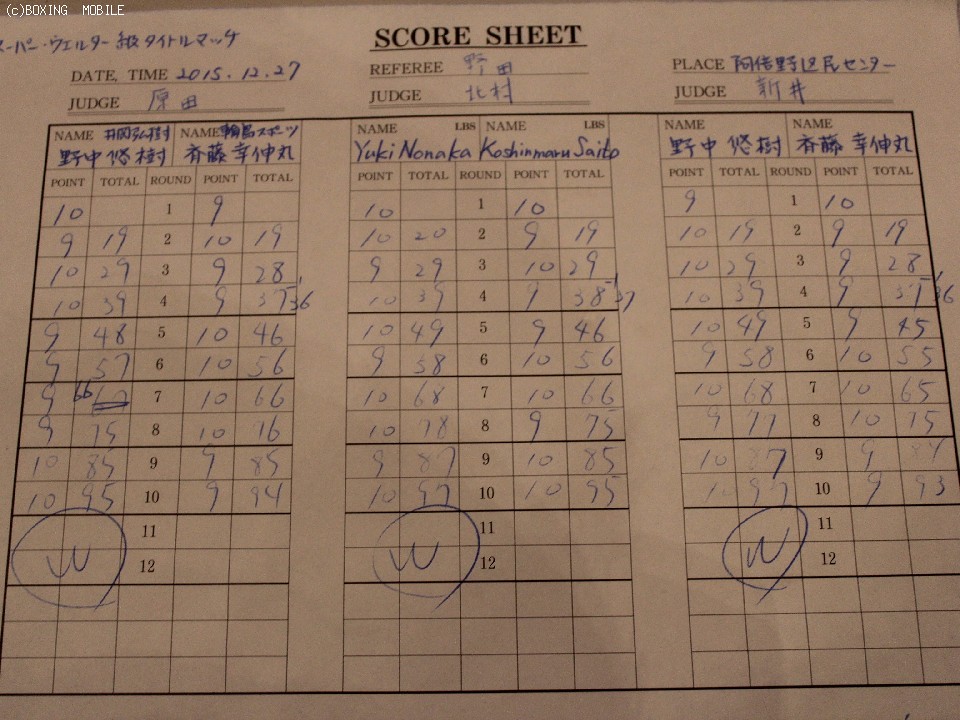序盤はタイトル獲得に燃える斉藤が右ストレートを中心に積極的に攻撃を仕掛け上々のスタートを切った。王者としての意地をみせる野中も打撃戦に応じてパンチをヒット。前半を2〜4ポイント差でリードした野中だったが、6回に斉藤の左ボディで腰を落とした。チャンス到来の斉藤だったが、野中は足を使って攻撃を外すと有効打を決めてポイントを重ねた。後半戦は追い込んだ斉藤だったが、野中が逃げ切り判定で3度目の防衛を飾った。