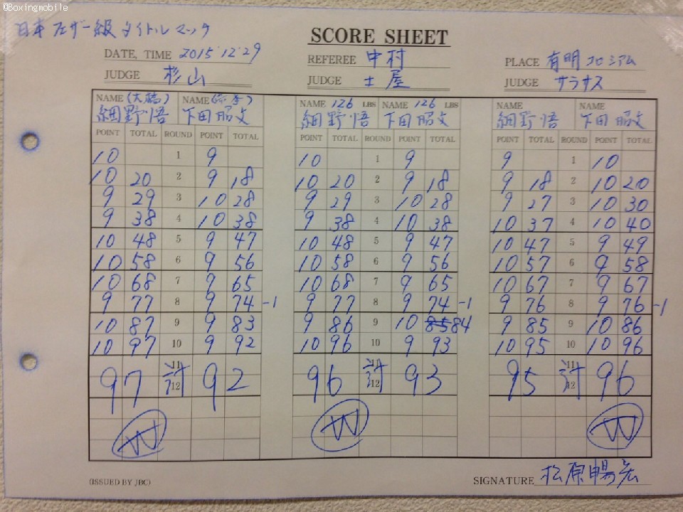判定は下田が96-95でジャッジ1者の支持を得たが、2者は97-92、96-93と細野を支持。細野がベルトを守り、5度目の防衛に成功した。