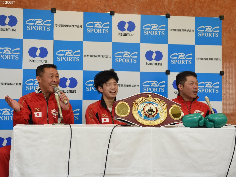 冒頭の挨拶で畑中清詞会長の「今年は東京、大阪に負けないようなボクシングシーンに残るような試合をお見せするのでよろしくお願いします」と始まった会見は終始笑いに包まれた。「内容的には良くなかったのでスッキリしていないし、あまり勝った気がしないですが勝てて良かった」と試合の感想を語った田中。「2016年中に2階級制覇を達成したい。時期は会長にお任せます」と抱負を口にした。