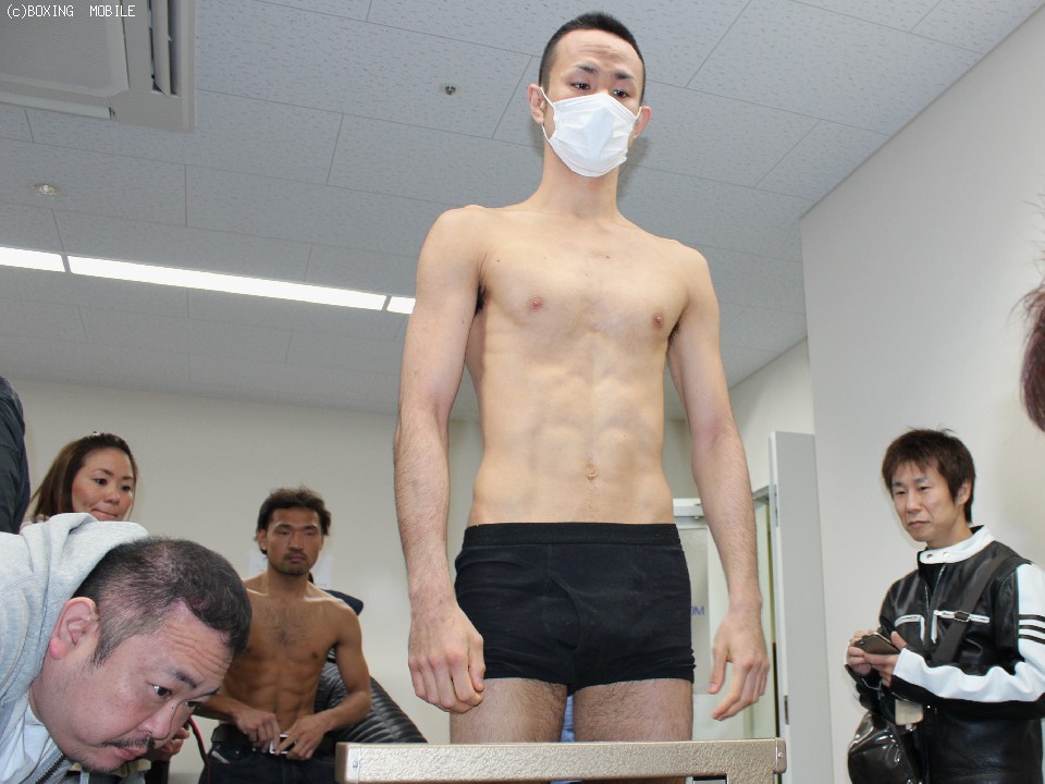 デビュー13年目にしてはじめてのタイトルマッチとなるベテランの大川はリミットちょうどの66.6kgで一発パス。「タイトルマッチの計量の雰囲気も楽しみたい」と笑顔を見せた。「新藤選手とはいつか対戦すると思っていたのでうれしい。ただ想像していたより小さいですね。明日はたとえボコボコの顔になってもとにかく勝ちます」と必勝宣言した。