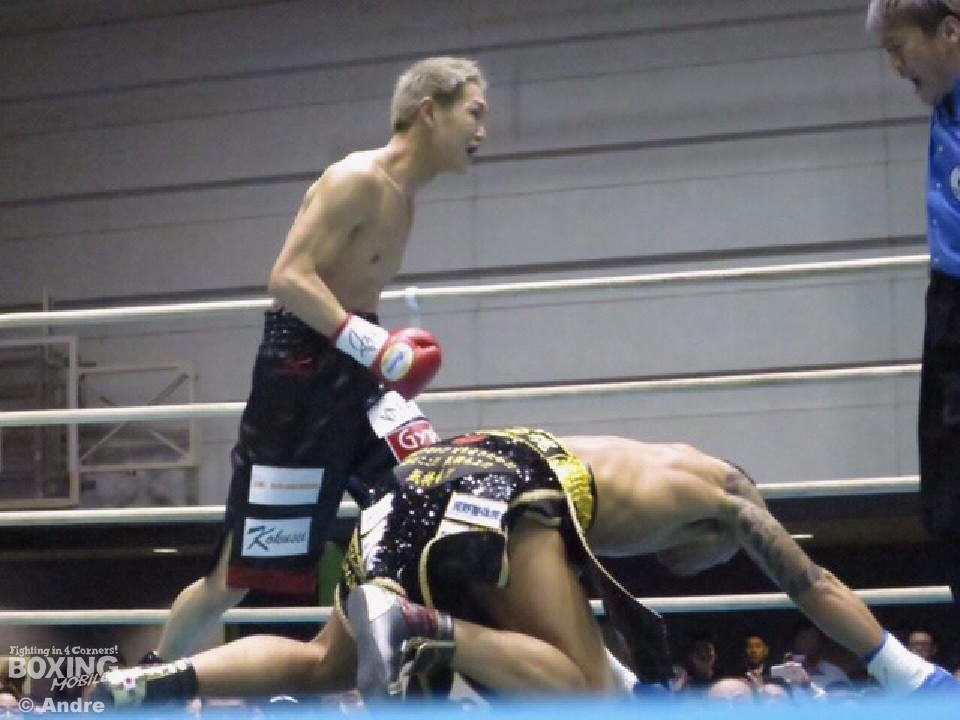 初回、ラストチャンスと公言して闘志を燃やす青木が猛然と追いかかるが中谷は冷静に対処。キレのあるジャブから強烈な右ストレートを打ち抜くと青木は腰を落とす。チャンスとみた中谷が一気にラッシュするとダウンを奪った。なんとか起き上がった青木に中谷は容赦ない怒涛の連打。防戦一方になった青木を見てレフェリーが抱き抱えた。前日計量で早い回に倒すと宣言していた中谷が有言実行のノックアウト勝利を飾った。