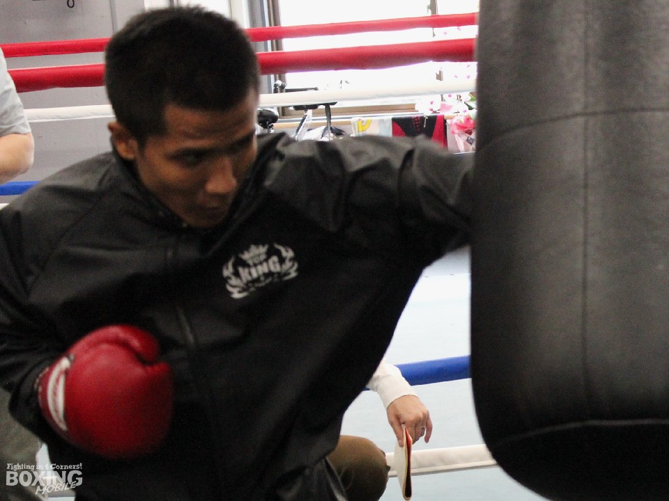 その後行われた練習ではシャドーボクシングの後にミット打ち、サンドバックを軽い調整。ほとんど汗をかかず、ウェイトも問題ない様子をみせた。試合以外では2011年に現WBA世界フライ級王者井岡一翔(26=井岡)のスパーリングパートナーとして来日経験があるというインタノン。世界タイトル初挑戦でベルトを必ずタイに持ち帰ると必勝を誓った。