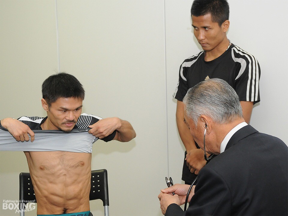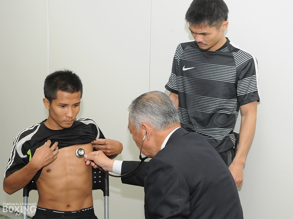 4月27日(水)、東京・大田区総合体育館で開催されるWBA世界スーパーフライ級タイトルマッチ、王者河野公平(35=ワタナベ)対同級7位のインタノン・シッチャモアン(29=タイ)の予備検診が後楽園ホール展示会場で行われ、試合を直前に控え静かに闘志を燃やした。
