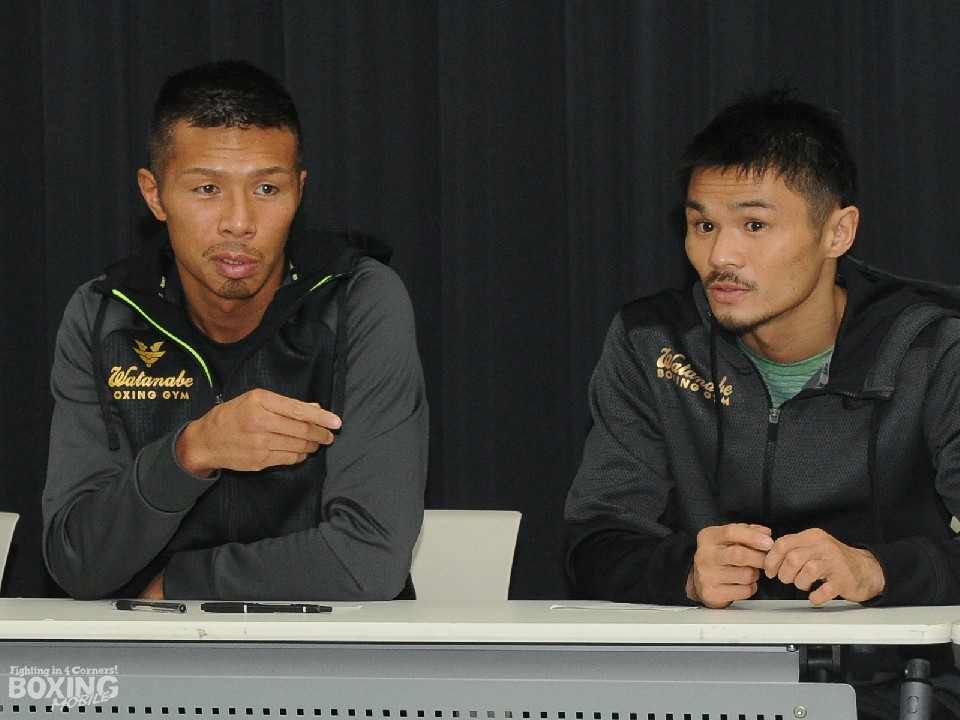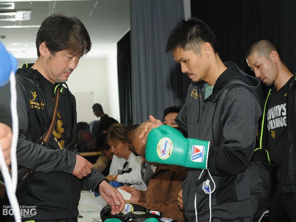 明日27日(水)のWBAトリプル世界戦、スーパーフェザー級スーパー王者・内山高志(36=ワタナベ)対暫定王者ジャスラエル・コラレス(24=パナマ)、スーパーフライ級王者・河野公平(35=ワタナベ)対同級7位のインタノン・シッチャモアン(29=タイ)、そしてライトフライ級王者・田口良一(29=ワタナベ)対同級7位ファン・ランダエタ(37=ベネズエラ)の調印式および前日計量が26日、試合会場の東京・大田区総合体育館で行われた。