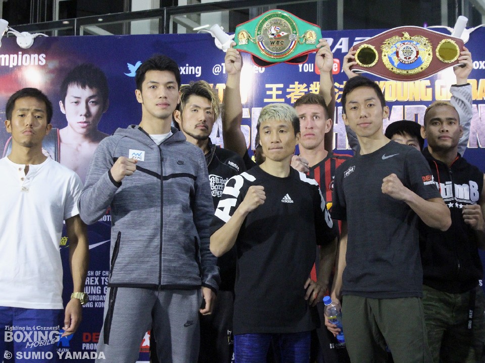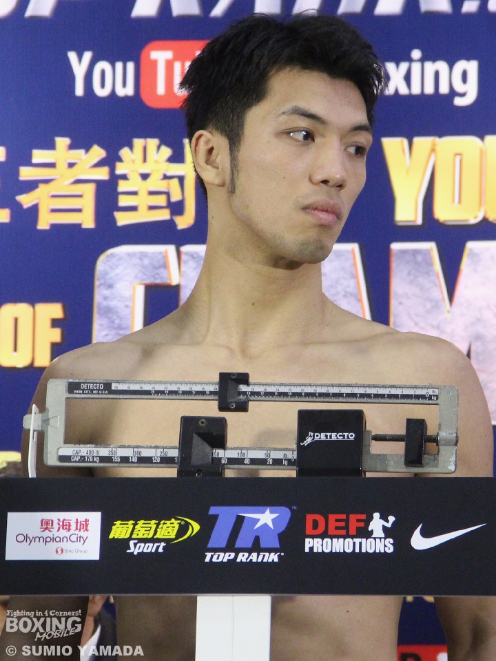 メインに出場するスーパーフライ級のレックス・ツォー(香港)は113.5キロ(約51.4キロ)、相手のぺ・ヨンキル(韓国)は114.6ポンド(約51.9キロ)だった。試合はWBOアジアパシフィックおよびWBCアジア・スーパーフライ級タイトルマッチとして挙行される。また、前座に出場するジャンボおだ信長本屋ペタジーニ(六島)は147ポンド(約66.6キロ)、相手のジェイ・ソルミアーノ(比)は146ポンド(約66.2キロ)で計量をパスした。さらにジェームス村重(KG大和)は136ポンド(約61.6キロ)、相手のジュナー・アダンテ(比)も同じ体重だった。