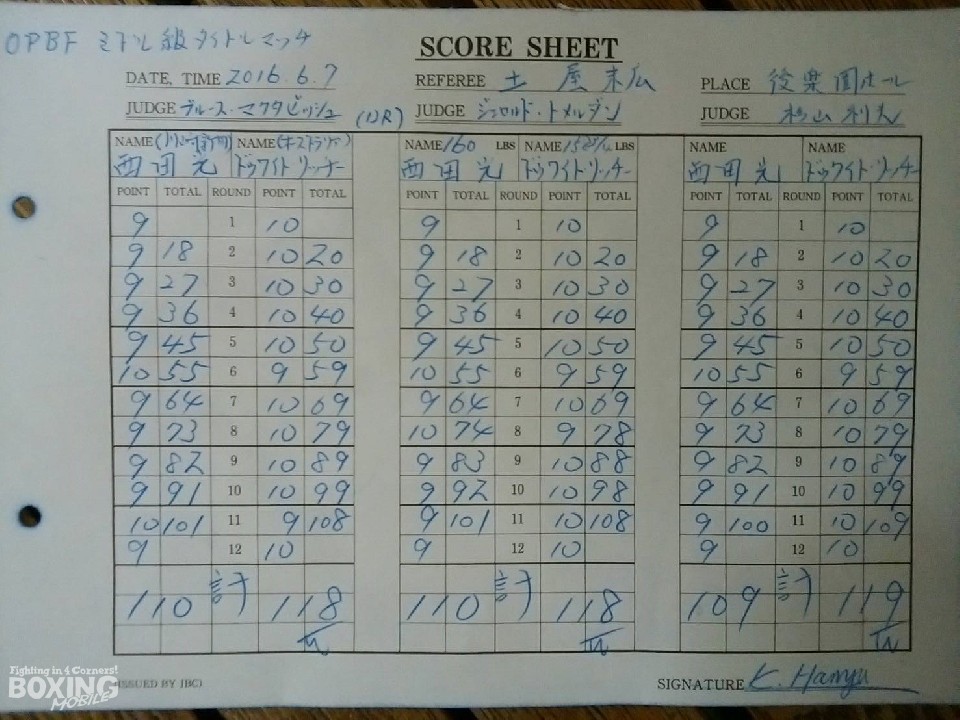 挑戦者は今回が初の海外戦となったが、固さは見られず初回から前評判どおりに足を使いジャブを突くボクシングで西田の圧力をかわした。西田は挑戦者を何度もロープに押し込むも捕らえきれず、手数・有好打でも上回られリズムに乗り切れないままラウンドが進んだ。終盤に入ってペースを上げた西田だが戦況は好転せず、このまま敵地で抜群の試合巧者ぶりを見せたリッチーが、118-110、118-110、119-109と8〜10ポイント差の判定勝ちでOPBF王座を奪取した。