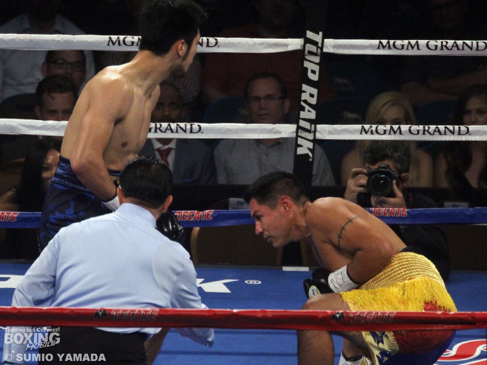 リングコールの際には笑顔を浮かべるなどリラックスした様子の村田は、相手の左右フックをブロックしながら攻撃のチャンスをうかがう。1分過ぎ、村田は右ストレートから左フックをボディにめりこませてダウンを奪う。