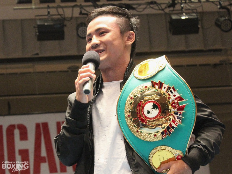 7月2日にアーデン・ディアレ(28=比)の持つOPBF王座に挑戦し、3度のダウンを奪う圧勝劇を演じ新王者に輝いた比嘉は「ご紹介いただきました次期世界チャンピオンになる比嘉大吾です。自分は日本人初の全KOで世界を獲ってファンの記憶に残るような試合をしたいと思っています。応援よろしくお願いします」と意気込みを語ると満員の会場から声援が送られた。次戦は11月に予定しているという。