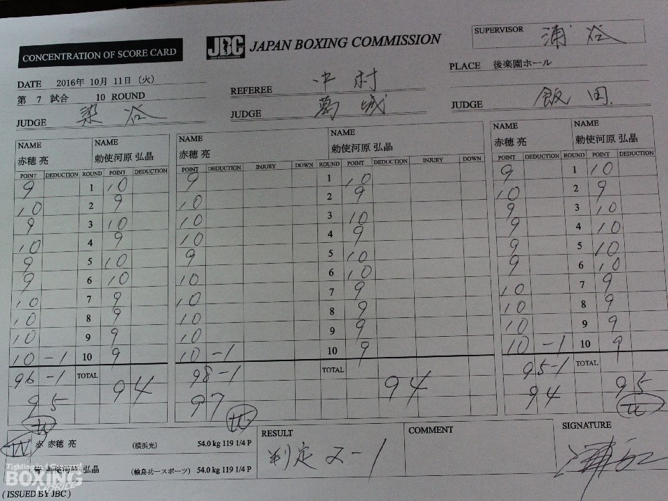 控室に戻った赤穂は採点を確認。「パンチはよく見えていたので競っているとは思わなかった。判定勝ちは想定していなかった。倒さないといけない立場なのに苦戦を許してしまった。今日は厳しく書いてください」と反省の弁が口を突いた。「相手は良く研究していたし、いきなりの左フックが上手かった。小手先だけでなく根性もあった。ノーランカーのレベルではなかった」 と勅使河原の強さを評価した。男気のあるマッチメークをしてくれた石井会長に感謝した赤穂は「一度負けている相手を日本に呼んで、借りを返してそれから世界を狙いたい」と昨年世界戦で敗退している前WBO世界バンタム級王者のプンルアン・ソーシンユー(タイ)との再戦を希望した。