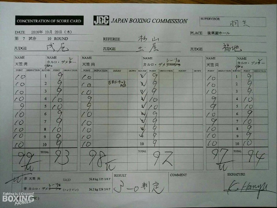 開始から天笠はプレスをかけて力強いパンチを繰り出していくが、デメシーショは強気に打ち返した。天笠は2ラウンドに偶然のバッテイングで左目上をカット。その後も天笠は手数を緩めることなくボディに入れていくが、デメシーショはガードで凌ぐと右フックで顔を弾き会場をどよめかせた。9ラウンドに連打で追い込み手を突かせたがこれはスリップの判定。デメシーショの粘りにKOを逃した天笠だったが判定勝ちで再起を飾った。