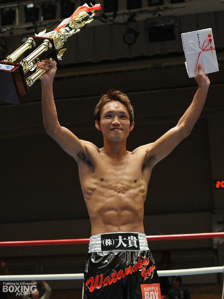 スーパーバンタム級は、昨年12月に石本康隆(35=帝拳)との王座決定戦に小差で敗れ、涙を飲んだ2位の久我勇作(ワタナベ)が、古豪サウスポーの1位ジョナタン・バァト(カシミ)と対戦。立ち上がりからテンポの良いコンビネーションで攻めた久我は、初回に左フックからの右アッパーでダウンを先制。その後はバァトのラフなファイトに手こずりもしたが、4回に連打で押すと最後は右ボディでバァトを悶絶させてのノックアウト勝ち。見事MVPと賞金100万円を手にした。