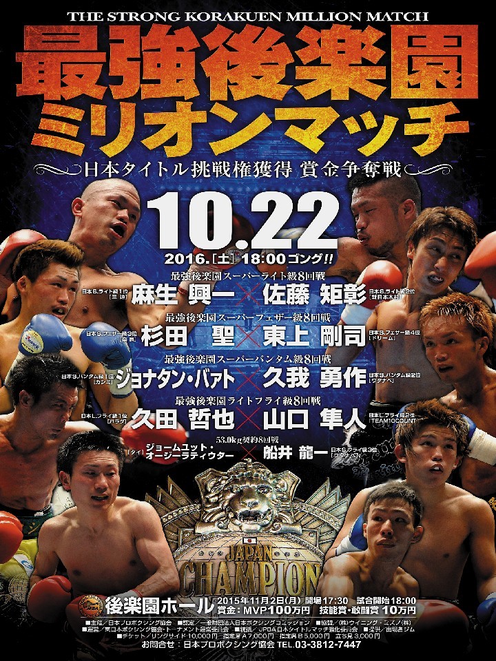 また、先日の最強後楽園を制したライトフライ級の久田哲也(ハラダ)、スーパーバンタム級の久我勇作(ワタナベ)、スーパーフェザー級の杉田聖(奈良)、スーパーライト級不戦勝の麻生興一(三迫)の4選手およびスーパーフライ級の船井龍一(ワタナベ)が指名挑戦者に追加された。なお、麻生との対戦を体重超過により中止した佐藤矩彰(新日本木村)は、2位から外れJBC預かりと厳重注意処分を受けた。