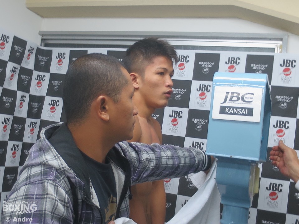 日本ボクシングコミッション関西事務局で17日、アポロジムのイベント「APOLLO THEATER BOXING」の前日計量が行われた。メインイベントでは10戦全勝(6KO)で東洋太平洋スーパーフェザー級2位の上原拓哉(21=アポロ)がマークイル・サルバニア(比)とWBC世界ユースフェザー級王座決定戦に臨む。2人は揃って事務局に姿を見せ秤に乗った。