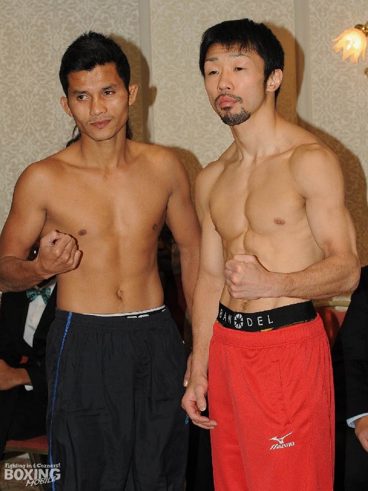 3階級制覇の実績を持つIBF世界ライトフライ級王者の八重樫東(33=大橋)と、挑戦者でIBF世界ミニマム級8位にランクされるサマートレック・ゴーキャットジム(32=タイ)の公式計量が29日午後、都内で行われた。両者は30日、東京・有明コロシアムで拳を交える。