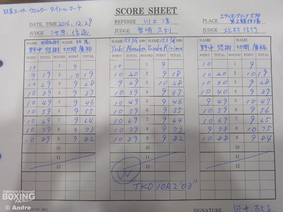 試合は、序盤からサウスポーの王者野中がジャブを上下に散らし左オーバーハンドで先制すると、切間は接近して左右のフックを狙う緊張感のある出だし。アグレッシブに右ジャブを連打しペースを握った野中が途中採点でも支持を得る。後半に入るとベテラン野中のボクシングが冴え切間のやりたいボクシングを封じる。すると10ラウンド、セコンドからGOがかかった野中が左を決めると切間の膝が揺れラッシュを仕掛けた野中がレフェリーストップを呼び込んだ。2年ぶりのKO勝利で野中が6度目の防衛に成功。