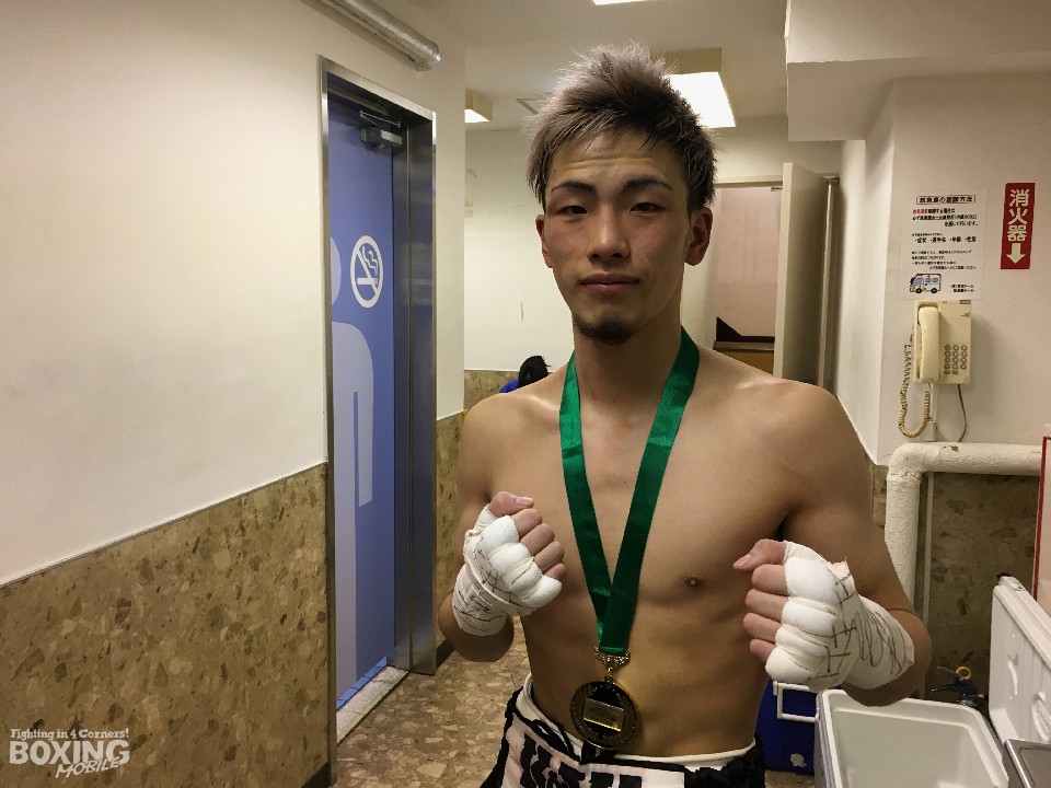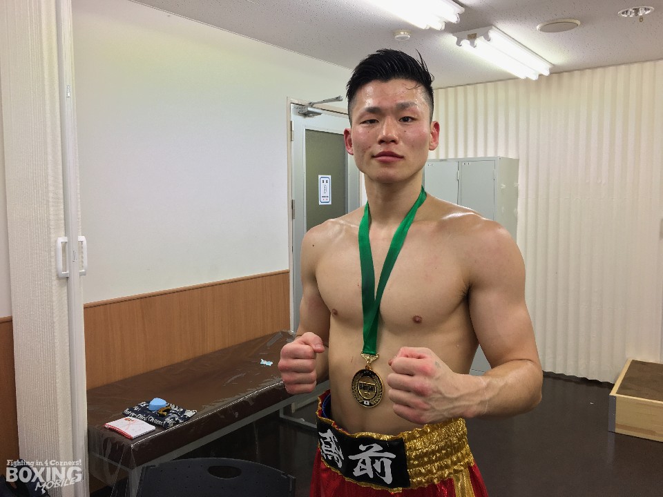 スーパーフェザー級で優勝した坂田尚樹(ワタナベ)は「ガードの上から力で倒した。技術はまだまだです。新人王トーナメントにエントリーできれば、獲りにいきたい」と笑顔で取材に答えた。