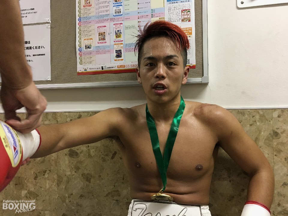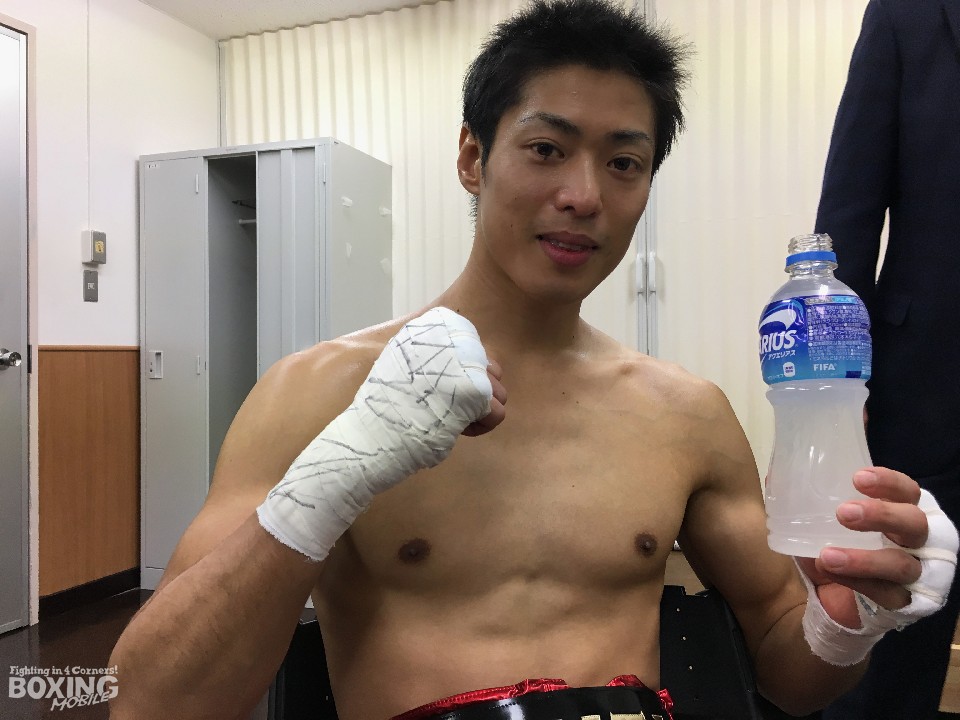 スーパーバンタム級で勝ち名乗りを受けた尾崎誠哉(K&W)は「1ラウンドは硬かった。2ラウンドは相手が右目上を切ったのでそこを狙ってジャブを打った。これから頑張ります」とさらなる飛躍を誓った。